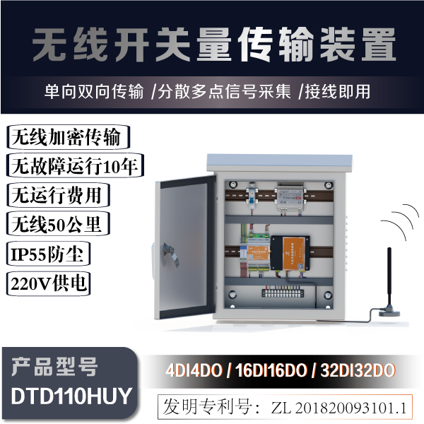 達(dá)泰1系[無(wú)線開(kāi)關(guān)量傳輸模塊]-DTD110HUY,可以直接代替有線進(jìn)行點(diǎn)對(duì)點(diǎn)的開(kāi)關(guān)量信號(hào)傳輸。[無(wú)線傳輸模塊]無(wú)需編程,運(yùn)用全數(shù)字無(wú)線加密傳輸方式保證數(shù)據(jù)安全可靠,有效傳輸距離50KM,后期無(wú)運(yùn)行費(fèi)用,配置防雨機(jī)箱,防護(hù)等級(jí)IP55。傳輸單向開(kāi)關(guān)量信號(hào),發(fā)射端裝置提供1-4路開(kāi)關(guān)量信號(hào)(信道數(shù)可定制)輸入,接收端裝置提供1-4路開(kāi)關(guān)量信號(hào)(信道數(shù)可定制)輸出,發(fā)射端與接收端成套使用。[無(wú)線io模塊]發(fā)射端可接入開(kāi)關(guān)量信號(hào),例如,浮球開(kāi)關(guān),PLC的IO口等設(shè)備;輸出端可接入數(shù)顯表,DCS,PLC等設(shè)備。在使用時(shí),外接220V電源并接入對(duì)應(yīng)信號(hào)線即可實(shí)現(xiàn)開(kāi)關(guān)量信號(hào)的無(wú)線通訊。